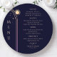 Mystical Rainbow Dark Navy Blue Sun Moon Stars Space Cosmic Astronomy Celestial Wedding Menu Cards features simple gold stars on a dark navy blue background with your menu details in the center in modern peach calligraphy script. Personalize by editing the text in the text boxes provided. Designed by ©2024 Evco Studio www.zazzle.com/store/evcostudio