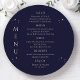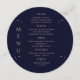 Mystical Rainbow Dark Navy Blue Sun Moon Stars Space Cosmic Astronomy Celestial Wedding Menu Cards features simple gold stars on a dark navy blue background with your menu details in the center in modern peach calligraphy script. Personalize by editing the text in the text boxes provided. Designed by ©2024 Evco Studio www.zazzle.com/store/evcostudio