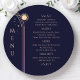 Mystical Rainbow Dark Navy Blue Sun Moon Stars Space Cosmic Astronomy Celestial Wedding Menu Cards features simple golden stars on a dark navy blue background with your menu details in the center in modern peach calligraphy script. Personalize by editing the text in the text boxes provided. Designed by ©2024 Evco Studio www.zazzle.com/store/evcostudio
