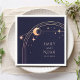Mystical Celestial Rainbow Sun Star Moon Astronomy Space Wedding Napkins features sun, moon and stars with a gold frame on a dark navy blue background. Personalize with your names and date or custom text in the center. Designed for you by © Evco Studio. Part of a collection at www.zazzle.com/store/evcostudio