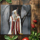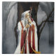 A wise and enigmatic wizard stands beneath a towering, ancient tree, cloaked in flowing white robes trimmed with rich red and gold. His staff, crowned with a glowing gem, hints at powerful magic, while a shadowy raven perches just behind his shoulder like a silent guardian or omen. The fog-draped forest wraps the scene in mystery, evoking themes of ancient knowledge, solitude, and arcane power. Perfect for fantasy lovers, gothic art enthusiasts, and those drawn to magical worlds filled with hidden stories.