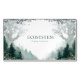 This moody and ethereal card design immerses the viewer in a misty winter forest landscape. The style is detailed rustic illustration, focusing on stark, high-contrast imagery. The color palette is dominated by cool, subtle shades of icy blue, deep forest green, and white-gray, giving the scene a frozen, mystical feel. The design features two massive, gnarled bare trees framing the top, set against a backdrop of dense pine trees and a foggy undergrowth. A delicate hand-drawn branch border frames the top and a simple line frames the bottom, keeping the central area wide and bright for clear text placement. The overall theme is winter nature, mysticism, and cool, tranquil solitude, perfect for an elegant, non-traditional, or nature-focused brand. This captivating design is ideal for professionals in holistic wellness, spiritual practices, winter event planning, fine art, eco-conscious retail, or rustic cabin rentals. It also suits artists, boutique owners, or individuals who want to convey a sense of calm, natural mystery, and dark academic aesthetic. This beautifully designed card can also be repurposed as miniature display signs, sophisticated product tags, custom packaging inserts, or elegant save-the-date cards for any business, event, or situation.