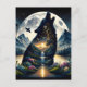 Picture within a picture. Double exposure art depicting a wolf howling at the moon with a mountains and forest and mountains background.