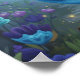 This whimsical poster features a vibrant blue jay perches gracefully on a branch, set against the soft, glowing backdrop of the mystical garden. This textured, layered painterly portrait highlights the bird's striking sapphire and indigo feathers amidst a whimsical landscape of blooming teal florals and magical fireflies.
