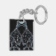 This whimsical keychain features a stylized, glowing blue frog. The frog is positioned centrally and appears to be sitting upright. It has large, prominent eyes and a wide mouth giving it a somewhat whimsical expression. The frog is wearing a robe or cloak that is decorated with a celestial pattern. This pattern includes crescent moons, stars of varying sizes, and what appear to be constellations. The robe is open in the front, revealing the frog’s front legs which are crossed. The entire image has a neon or glowing effect, with bright blue lines outlining the frog and its robe against a solid black background. The overall aesthetic is fantastical and somewhat mystical.