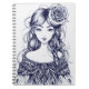 This whimsical notebook features a cute sketch of a young woman with a rose in her hair.