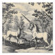 Mythical unicorn meeting a deer stag in the forest, published in the medieval Book of Lambspring, filled with symbolic images from the middle ages showing the distillation and extraction of pure gold from base metals in an alchemy laboratory.