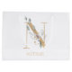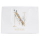 Letter N monogram floral. Letter N in golden brown texture accented with green watercolor compound leaves, flower blossoms and gold dust. Personalized with name in matching font.