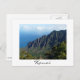 Postcard of the rugged cliffs of the Kalalau Valley at the Na Pali Coast of Kauai, Hawaii, USA seen from the Kalalau Valley Lookout Point and accessible via the Kalalau Trail with a white border and the text: 'Kauai'.