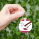 Declare your love for nail polish with this key chain with the phrase "Nail Polish Queen." This is a round key chain with a nail polish brush dripping plum colored nail polish on a aqua blue and white background.