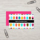 Bold and colorful playful design. Colorful patterned nails in yellow, teal and neon pink cover the card with a single black strip in the centre for the business name. The back of the card is white text on a girly pink background. Everything on the design can be customized.