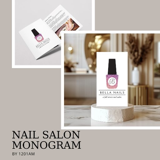 This glamorous nail salon tri-fold brochure design features your initial in a beautiful script font centered on a faux purple/pink glitter nail polish bottle for an instant logo. Your name or business name is elegantly styled underneath. A creative design treatment for nail salons, nail artists, nail polish companies, beauty products and more. Update the customizable text to fit your brand, and personalize the details throughout the brochure for your own usage. All stock photos can be replaced with your own photos. These 5x7 brochures are perfect to display your price lists and menu of services, or describe your product line. A great marketing piece to hand out to potential clients to quickly introduce your business. Please contact the designer for help with special typesetting or layout variations. Art and design © 1201AM Design Studio | www.1201am.com