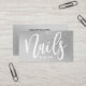 This is the perfect business card for a trendy, stylish, girly, and modern Nail Technician. This design features a simple white handwritten brush script typography on a faux printed diagonal sparkly silver glitter and light gray ombre gradient glamorous and chic background. Whether you are an independent nail tech or you work for a salon these cards will add that personal and professional touch to your business and career advertisement.