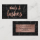 A modern, stylish nails and lashes, eyes makeup artist business card with modern hand lettering style brush typography in faux rose gold foil on a trendy and elegant black marble background.