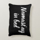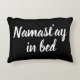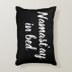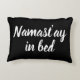 Namastay in bed brush script lettering funny black accent pillow . Create your own unique hand lettered cushion with custom quotes. Elegant calligraphy typography template. Beautiful handwritten bedroom decor. Black and white handwriting design with swirly text. Funny Holiday or Birthday gift idea for yoga fan, lazy person, couple, boyfriend, husband, wife, bride, girlfriend, friends, family etc. Customizable colors. Relax humor.