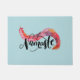 Namaste is swirly script with watercolor curved colorful feather on light aqua background
