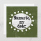 Bold text reading "Namaste, my dear" is centered against a green background. The black text sits on a white circle with large textured white dots around it, providing a playful contrast against the colorful backdrop.
