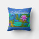 Elegant pillow featuring a bright pink lotus blossom among lilypads in a pond and custom text. Text shown here is the word Namaste.