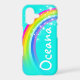 Help protect your child's iphone from knocks and kiddy accidents, with this pretty rainbow design girls tough iphone case. Personalise with your childs name up to 5 letters, perfect short names or nicknames. This example reads Oceana. Exclusively designed and illustrated by Sarah Trett.