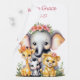 Wrap your little one in cozy charm with this elegant safari baby blanket featuring a sweet group of watercolor jungle animals. A baby elephant, lion, giraffe, and zebra sit together with soft blush floral crowns, creating a beautifully coordinated look for a baby girl’s nursery. Designed in a delicate pastel palette with a clean, minimal background, this blanket adds a gentle touch of luxury to cribs, rockers, and tummy time.