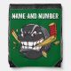 Name and Number on Cool Funny HOCKEY Backpacks, Drawstring style. Type in your Name and Jersey Number and see how to change the green and white colors to your favorite and hockey team colors. Great gifts for hockey players and kid. CALL Linda to help you or for design and color changes: 239-949-9090
