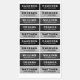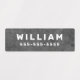 Waterproof property labels with customizable name and telephone number on light to dark gray, rough cocrete backgrounds. Great for labelling your children's belongings