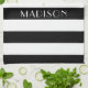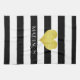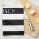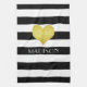 Kitchen towels with a stylish gold heart print on a black and white striped pattern with personalized name print. Matching kitchen decor available.
