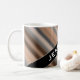 This mug design features a blurry striped pattern inspired by rustic colors like shades of brown, gray, and beige. It also features a custom name in white colored text within a dark colored area, with both at an angle. [~Z0000051]