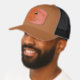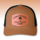 Family name, 'Family Reunion', tree silhouette, personal name on a 2mm convex rectangle leather patch are featured on this handsome caramel and black trucker hat. Make font changes and edit text to make it yours using the easy Design Tool. Choose from three solid colors and 12 combination colors. Other shapes are available and can be adjusted to fit using the Design Tool. See "About" for more information and care.