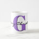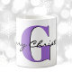 Merry Christmas in elegant black script, a large initial in February birthstone medium purple amethyst, and name in a simple modern font decorate this bold 11oz classic coffee mug. Large capacity for hot or cold beverages. Easily change the initial, text and name to make it yours using the Template provided. . Ideal for family Christmas morning coffee or celebrating throughout the winter holidays. Also available in 15oz and many other mug styles. See "About This Product" for more information. Special pricing.