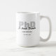 A PhD graduation large mug that includes the graduate’s name, field of study, and graduation date. The mug includes the name in a handwriting script font and a black and gray design. Simply add the graduate’s info, add this mug to your cart, and congratulations on this major milestone!