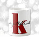 Merry Christmas in elegant black script, a big lowercase initial in a January birthstone (deep red) garnet, and name in a simple font decorate this bold 11oz classic coffee mug. Large capacity for hot or cold beverages. Easily change the initial, text and name to make it yours using the Template provided. . Ideal for family Christmas morning coffee or celebrating throughout the winter holidays. Also available in 15oz and many other mug styles. See "About This Product" for more information. Special pricing.