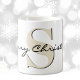 "Merry Christmas" in elegant black script, a large subtle initial in June birthstone pearl color, and name in a simple modern font decorate this 11oz classic coffee mug. Large capacity for hot or cold beverages. Easily change the initial, text and name to make it yours using the Template provided. Ideal for family Christmas morning coffee or celebrating throughout the winter holidays. Also available in 15oz and many other mug styles. See "About This Product" for more information. Special pricing.