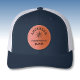 Family name, 'Family Reunion', compass star, bold personal name on a 2mm round leather patch are featured on this classic navy blue and white trucker hat. Choose from three solid colors and 12 combination colors. Other shapes are available and can be adjusted to fit using the Design Tool. See "About" for more information and care.