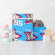 Birthday wrapping paper in blue and red add your own photograph design. Personalize this star birthday paper with your own photo, name or relation and age. Currently reads Happy Birthday Frankie 85 today. Ideal to wrap a special gift for a eight-five year old's and to add a photo of them in there youth to put a smile on there face. Uniquely designed by Sarah Trett.