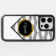 This black and white horizontal zig zag pattern design sets off the top of the case featuring a gold glitter calligraphy circle with template text over a white bottom. Fill in the template field or click customize to select a typeface style, size, and color you like.
