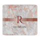 Personalize black name and dark brown monogram on rose gold bar over white and rose gold marble.