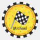 You will find many uses for this round sticker as a fan of mother racing of any kind. Personalize with your name or other words or congratulations - make it your own. A waving black and white checkered flag is centered on a textured yellow background and has a black and white checkered border. The red words around the inside of the border and say Race Fan, Start the race and checkered flag. Green stars are on the background. Great for any type racing - auto, motercycle, bike, derby and more. Fully customizable for a tailgate party or for entertaining to show your love of the sport. Customizable and coordinates with other accessories for a great party or event.