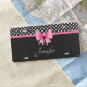 License plate with a girly pink bow and ribbon on a back and white polka dots pattern.