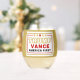 Stylish Trump-Vance America First, 2025 "The Golden Age" gold & red banner featuring name in a stylish font decorate this trendy 16oz. stemless wine glass. Easily change the name, add text, or remove to make it yours using the Template provided. See "About This Product" at side for more information and care.
