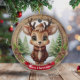 Name Whimsical Reindeer Rustic Holiday Tree ceramic ornament! Xmas Deer Antlered Animal Character decoration Featuring customizable white text saying "Merry Christmas" on a vibrant red ribbon – easily swap it out for a loved one's name to make it truly personal gift tag. Round framed, brown wooden style with charming accents of pine cones and evergreen branches for that cozy, woodland vibe. At the center is a cute, whimsical reindeer in cartoon graphic style, dressed in a brown coat and hat, evoking the spirit of wildlife with a festive twist. The background showcases an enchanting winter wonderland scene complete with a snow-dusted trees, capturing the joy of the winter season. This two-sided, personalizable decor ensures festive charm from every angle – the delightful illustration appears on both front and back, so it always looks complete no matter how it spins while hanging. Perfect for gifting or decorating, and you can transfer this unique design to a variety of other products, from mugs to cards and more! Personalize your pinecone decor and bring home this delightfully unique keepsake today – visit Zazzle to customize and order now!