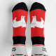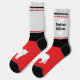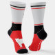 Fun red, black and gray personalized crew socks for cat lovers. These fun socks feature a beautiful illustration of a white cat, a paw print pattern and some horizontal stripes. Each sock is decorated with a custom name printed in a bold calligraphy font with a monogram printed in whit in the background. They make a practical, unique, and adorable gift for a true cat lover.