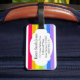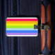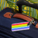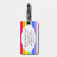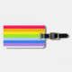 Bright rainbow stripe luggage tag in red, orange, yellow, blue, green, purple. Customize the reverse of this tag multi coloured tag with your name and address details. Pattern and tag by Sarah Trett.