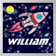 Cartoon graphic rocket space poster. Great to brighten a space themed kids room. Personalise this item with your child's name (up to 7 letters). (***Please note some names will not always fit due to the nature of the font, please contact me and I will be happy to post a poster with your name on). This example reads: William. Uniquely designed by Sarah Trett.