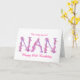 Pretty Nan text watercolor art card, the words Nan painted in purple and twisted with sweet pink orchid flowers. This whimsical card can be customized with your own mothers birthday age and choice of greeting inside, this design is also available on other products. © Original watercolor art and design by Sarah Trett. www.sarahtrett.com for www.mylittleeden.com