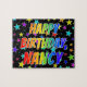 This exciting, vibrant, birthday-themed jigsaw puzzle design has the message "HAPPY BIRTHDAY, NANCY" with the characters having a colorful rainbow spectrum inspired gradient pattern, in addition to a fun stars background pattern. An exciting puzzle like this might be used to send birthday wishes to somebody named Nancy. [~Z0000468]
