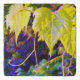 Sunlit grape leaves and delicately curling tendrils make a striking image against a background palette of blue, purple, pink and green.