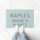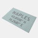Stylish front doormat with Naples Italy city latitude and longitude map coordinates in modern gray industrial font on light blue background