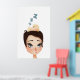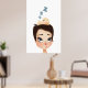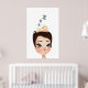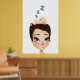 Artistis poster with a girl and a bird sleeping on her head. A beautiful girl with a short haircut looking up at a yellow birdie taking a nap. Cute children's book illustration, print for kids.