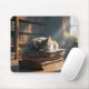 A tabby cat peacefully naps atop a stack of old books, bathed in warm sunlight streaming through a library window
